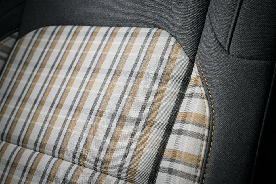 - Plaid seats with black leather-accented bolsters