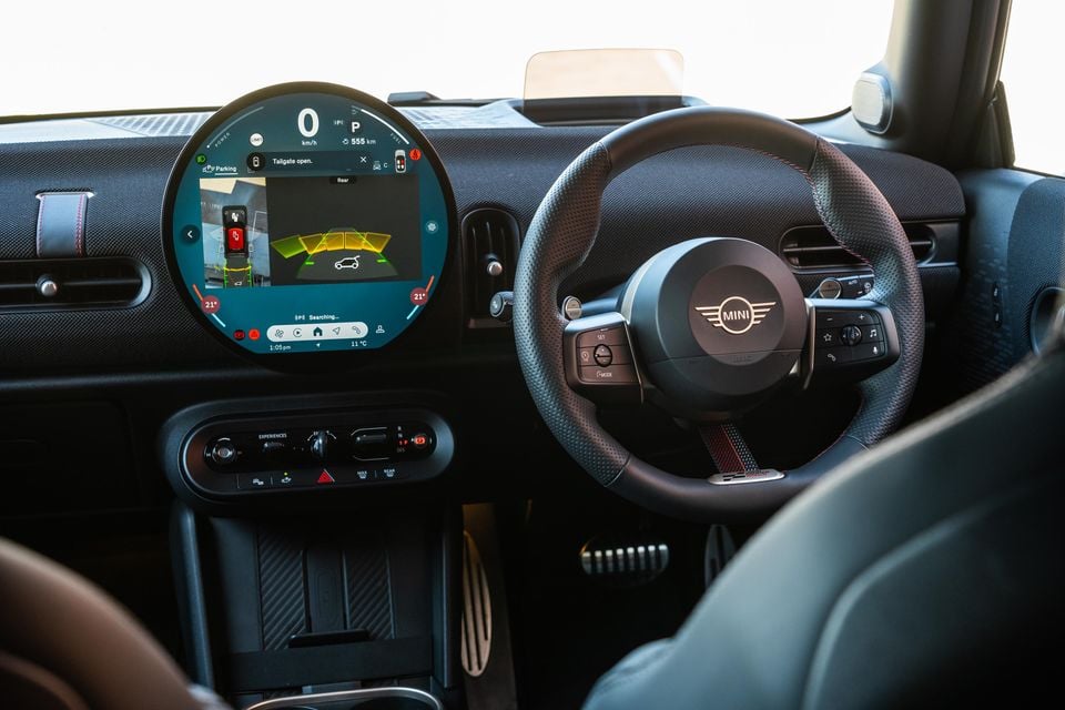 As for the seats, they’re JCW-specific and finished in a synthetic leather-and-fabric mix with numerous sporty design elements. They’re understandably quite firm with strong bolstering, but at least there’s powered adjustment and heating, albeit no ventilation.