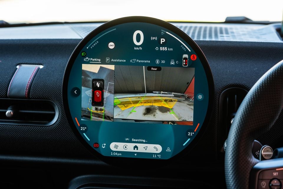 It’s difficult to miss the large circular infotainment display in the centre of the dash, which mirrors the circular panels of the first two BMW-built Cooper generations. Where those generations primarily used this space for the vehicle’s analogue rev counter, the current hatch offers a full digital screen that builds on the concept introduced with the previous-gen car.