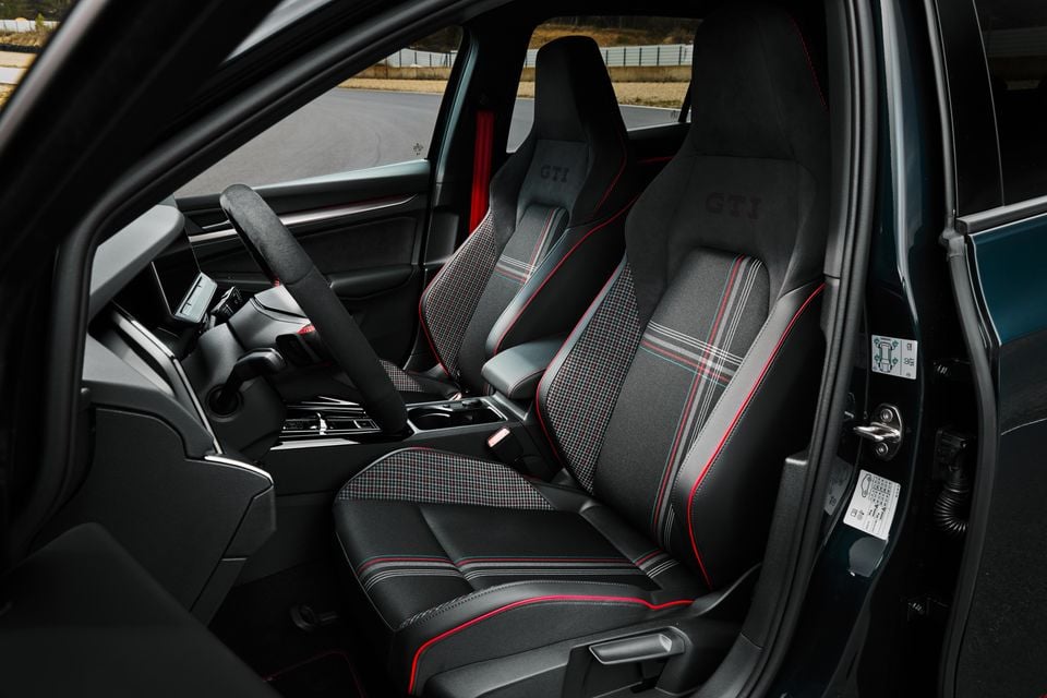Much more impressive are the figure-hugging bucket seats up front. They have integrated head restraints and an upholstery design unique to the Edition 50, including a new take on the traditional ‘Clark’ tartan, ArtVelours for part of the backrest and classy GTI logos with a red backing.