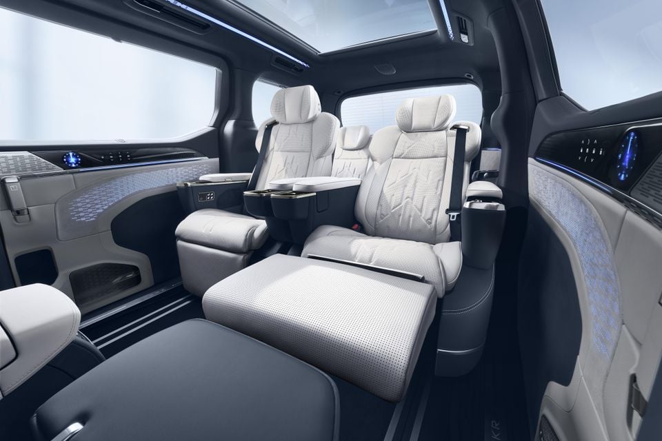 The rear doors slide open to reveal a light, airy compartment dominated by a pair of opulent captain’s chairs, each with dedicated armrests and an enviable list of features – heating, ventilation, massage, electric recline, adjustable headrests, sliding seat bases and powered leg rest extensions.