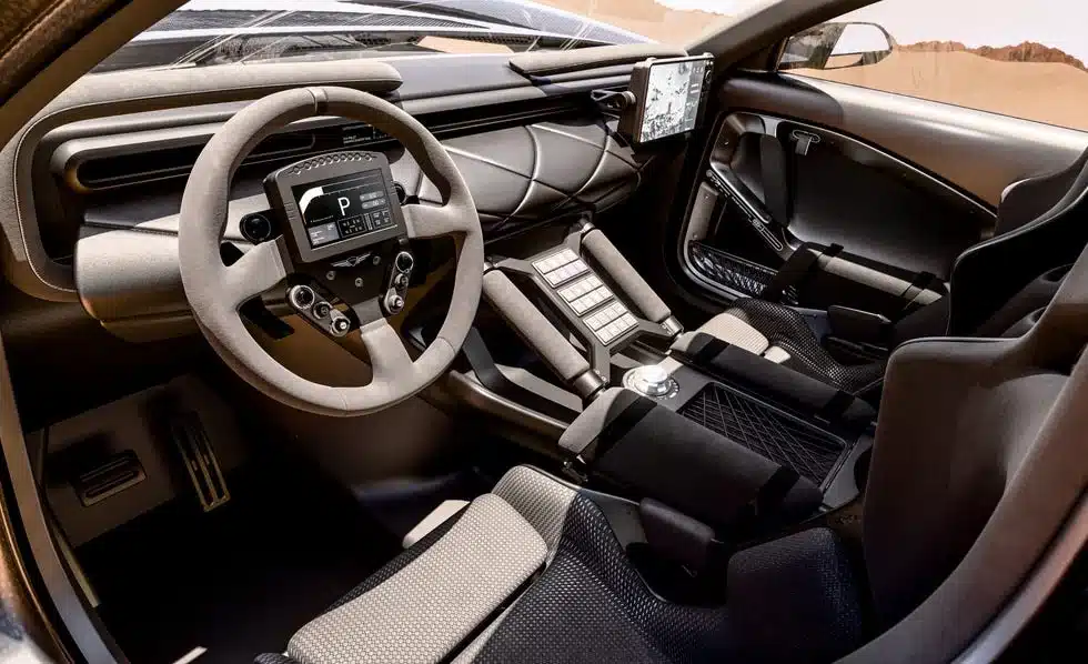 Coming to its bodywork, it features a combination of Kevlar, fiberglass, and carbon fiber so that it can have less weight for ultimate performance. A tubular frame sits close to the panels and paired fenders, providing a wide breakover angle so it can’t get stuck at the high peak or sharp dunes. There is an air intake that’s mounted to the roof, which gives it a visual appearance of a scorpion stinger.