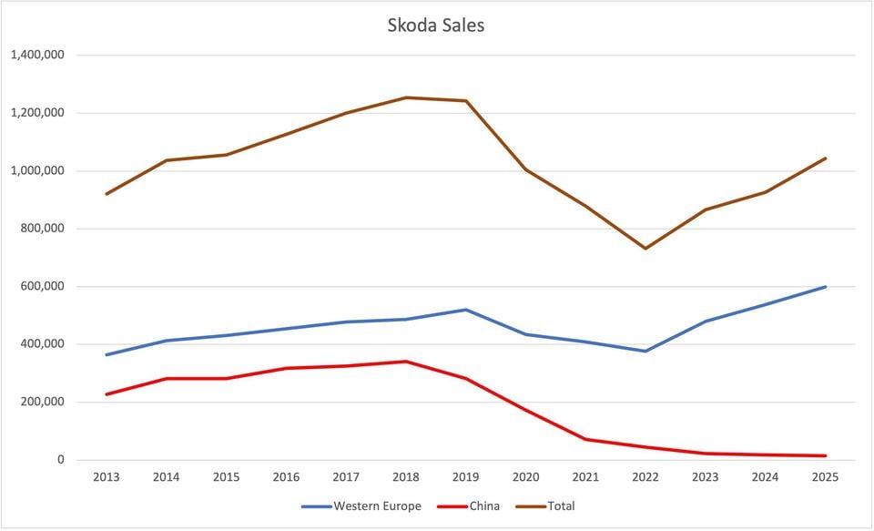 Skoda will be leaving the Chinese market by the middle of 2026, less than eight years after hitting its sales peaq — sorry — in the country. In that time Skoda’s sales in China have gone from more than a quarter of its global total to a rounding error.