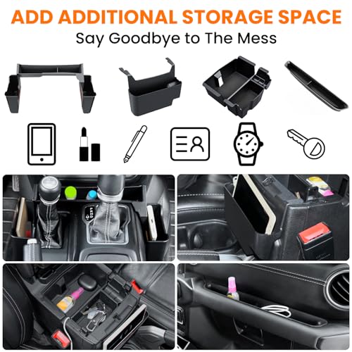【Fitment】4PCS upgraded center console organizer compatible with Jeep Wrangler JL JLU 4XE 2018 2019 2020 2021 2022 2023 2024 2025 and Gladiator JT 2020 2021 2022 2023 2024 2025 2/4 door, (Not for JK/JKU).Perfectly compatible with Wrangler JL JLU 4XE & Gladiator JT accessories.