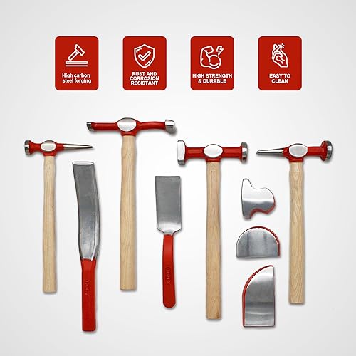 【INCLUDE】:(1)Pick and finihing hammer (1)Chisel and finishing hammer (1)Heavy bumping hammer(1)Door skin hammer (1)Universal dolly(1)Toe dolly(1)Heel dolly(1)General purpose spoon(1)Light slapping spoon