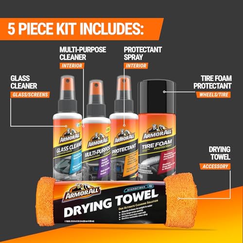 CAR CLEANING KIT: 5-piece Armor All Starter Car Care Kit includes Original Protectant, Glass Cleaner Spray, Multi Purpose Cleaning Spray, Tire Foam and Microfiber Towel
