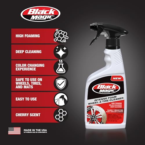 Transform your wheels and tires with the power of Black Magic 22 fl. oz. Intense Foam Wheel & Tire Cleaner, the ultimate solution for a spotless, showroom-ready finish. This high-foaming formula effortlessly lifts away stubborn dirt, grime, and brake dust, delivering a deep clean without the need for scrubbing. The magic lies in its color-changing technology—watch as the foam changes from white to brown, visually showing you the contaminants being dissolved and removed. In just a few minutes, your wheels and tires will be restored to a slick, like-new appearance. Safe for all types of wheels, tires, and even wheel wells, this powerful yet gentle formula ensures your vehicle gets the best care without risk of damage. Black Magic makes cleaning effortless—just spray, watch the foam work, and rinse for an eye-catching shine. Plus, the fresh cherry scent elevates your cleaning routine, making it a more enjoyable experience. Whether you’re prepping your car for a special occasion or keeping it looking pristine day-to-day, this cleaner delivers professional results with minimal effort. Step up your car care game with Black Magic Intense Foam Wheel & Tire Cleaner—because your wheels deserve to shine as bright as the rest of your ride!