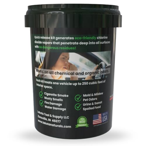 FAST RELEASE – Lakota Naturals chlorine dioxide car deodorizer odor eliminator kit begins working immediately to eliminate any odors caused by pets, food, oils, smoke and more. Remove smoke smell from car fast!