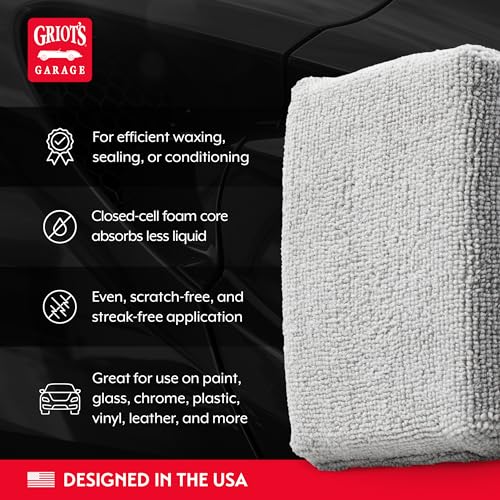 Achieve a smooth, even finish faster with Griot’s Garage Microfiber Applicator Pads, built for precise product application and minimal waste. Designed for efficiency and precision, these microfiber wax applicator pads feature a closed-cell foam core wrapped in premium short nap microfiber that delivers smooth, even application with minimal waste. The 1 1/4″ thick, 4″ x 5″ design covers large surfaces quickly, making them ideal for applying waxes, sealants, dressings, conditioners, and more. Unlike traditional applicators that soak up too much product, these car detailing applicator pads are engineered to hold just enough for consistent coverage, helping you get more out of every bottle. The ergonomic, form-fitting shape sits comfortably in your hand, giving you better control with less effort, ideal for extended detailing sessions. Safe for use on multiple surfaces, the scratch-free microfiber glides effortlessly over paint, glass, chrome, vinyl, plastic, and leather without leaving behind streaks or residue. Whether you’re working with Best of Show Wax, Carnauba Paste Wax, Leather 3-in-1, or Vinyl and Rubber Dressing, these versatile polish applicator pads are a must-have for any detailing routine.