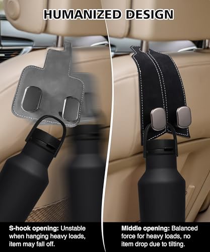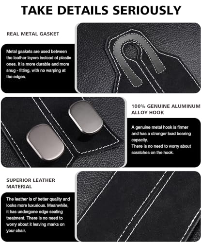 INTRINSIC ADVANTAGE -This purse hanger for car features a metal gasket in the leather layer. Compared to other car hooks with plastic gaskets, our metal gasket significantly enhances the connection strength between the hook and leather. This makes our car hangers for seat sturdy and fit during use. It completely avoids the potential internal fracture problem of plastic gaskets, providing an extremely safe and reliable usage experience