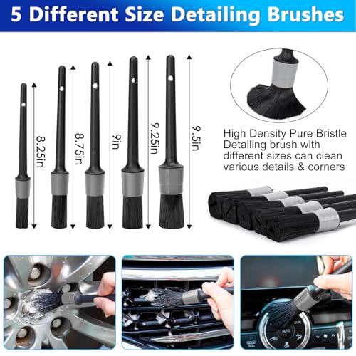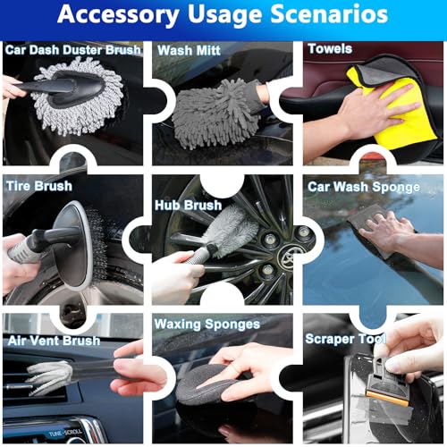 Professional Interior & Exterior Detailing Tools: 5 precision detailing brushes clean vents, seams. Specialized tire and hub brushes remove stubborn brake dust. The air vent brush and dash duster maintain dust-free interiors, while the mitt and sponge ensure gentle exterior care. All accessories store neatly in the included storage bag