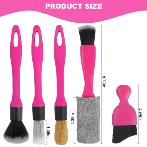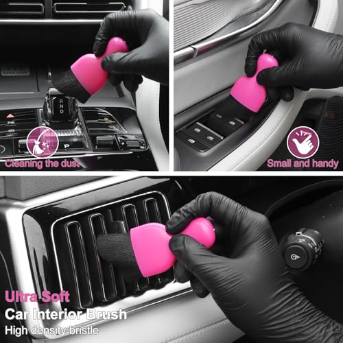 【Complete Pink Car Interior Detailing Kit】 The car detailing kit include natural wild boar hair detail brush * 1, soft hair detail brush * 1, fiber detail brush * 1, ultra soft mini dash brush * 1, dual head car duster brush * 1, car cleaning gel * 1,organizer bag * 1. Different brush heads are designed for specific areas of the car. These brushes excel in reaching even the smallest crevices that car wash sponges or towels may miss, providing a thorough and meticulous cleaning experience.